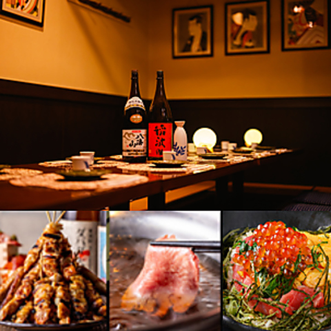 【デートや女子会に人気の落ち着いた個室】ゆったり過ごせる落ち着いた個室空間は、デートや女子会に人気。木の温もりを感じる柔らかな照明の中で、名物鶏皮串や創作和食を楽しめます。少人数でのご利用に最適なプライベート空間です。