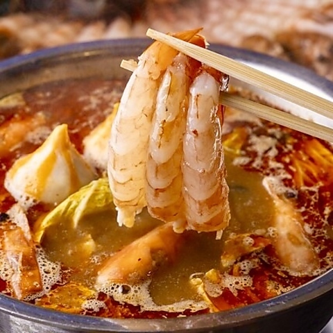 早くもリピーター続出!コクがあるピリ辛スープと人気NO1のエビしゃぶ鍋を融合させた新感覚の旨辛鍋!