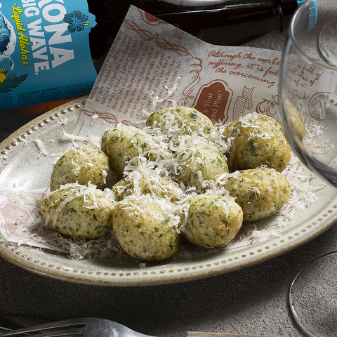 外はカリッと、中はもちっと香ばしい食感に、ふんわり粉雪のようなチーズをまとわせました。軽やかな塩味がワインにもよく合う一品です。