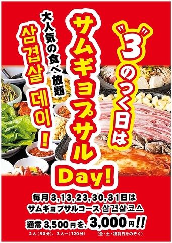 3がつく日(3、13、23、30、31)は超お得◎サムギョプサル食べ放題コース3500円⇒3000円※金・土・祝前除く