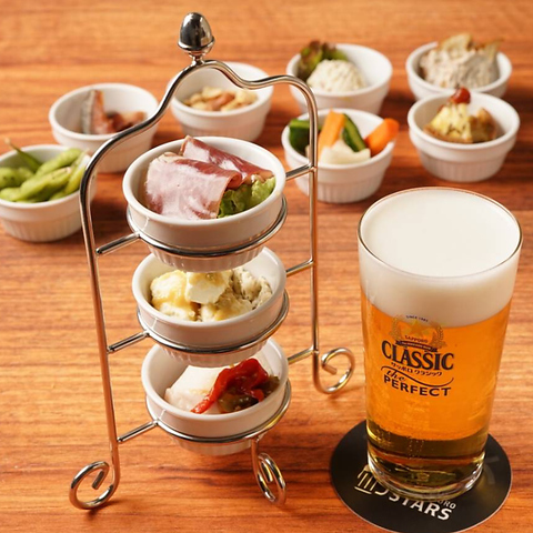 <選べるビールとアンティパストのちょい飲みセット>黒ラベル or クラシック3種選べるアンティパスト(1)おとなのポテサラ (2)ラムの生ハム (3)鯖のリエット (4)ミックスナッツ(5)カレー風味のキッシュ (6)野菜のビール漬け (7)サラダチキンのピペラード (8)芽室産枝豆の燻製塩 (9)鮭とば (10)クリームチーズの山葵味噌