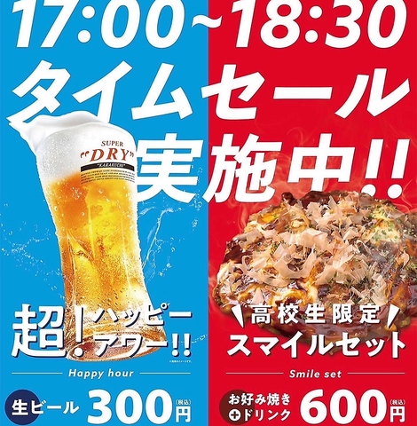 17:00~18:30の間にご注文いただくと生ビール300円!その他ドリンク100円で提供いたします。お得にドリンクを楽しめるハッピーアワーにぜひご来店ください♪※お1人様1品ご注文ください。※一部ドリンクは除く