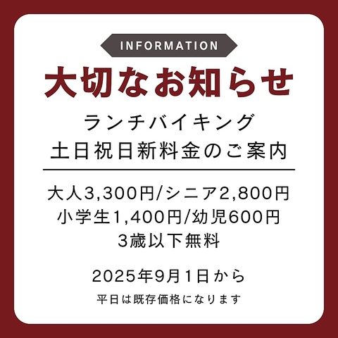 9/1~ 【土日祝日】ランチブッフェが新料金となります。詳しくはHPをご覧ください