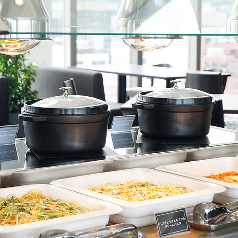 一面の窓から陽光が降り注ぐ開放的な店内で、シェフこだわりの料理を思う存分お召し上がりいただけるランチバイキング。