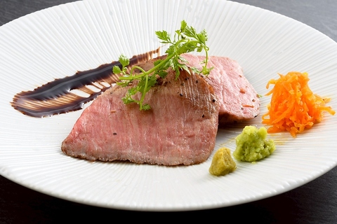 職人が厳選した特選牛のランプを丁寧に処理し、低温でじっくりと調理することで牛本来のうまみを閉じ込めた和牛のローストビーフ。