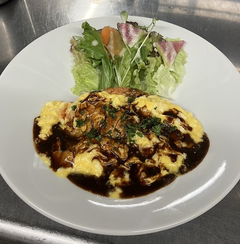 <サラダ・スープ付き>ふわふわの卵で包まれたオムライスは、食べる楽しみが満載!特製デミグラスソースが絶妙に絡みます。クリーミーでリッチな味わいが広がり、心も満たされる一皿☆ランチにぴったりな満足感をお届け♪