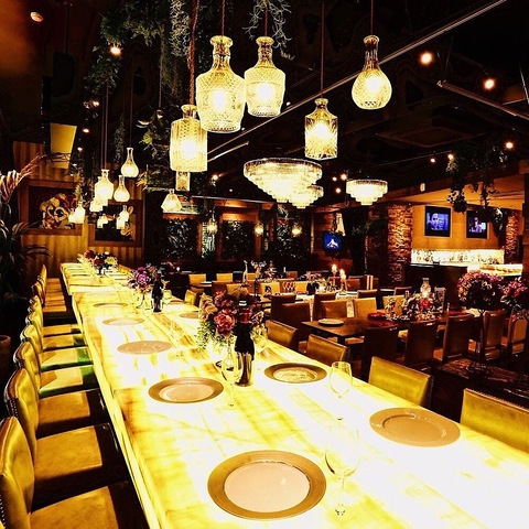 店内はクリスタルのシャンデリアやダウンライト等のこだわりの照明とラグジュアリーなインテリアで雰囲気抜群の空間♪団体様の貸し切りなど様々なシーンにお使い頂けます!記念日・女子会にもオススメ♪