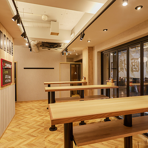 総席数108席の広い店内は、2つのフロアーに分かれています。入り口側は、白木を基調としたテーブルや立ち飲みスペースをご用意しており、ザ・酒場といった雰囲気をお楽しみいただけます。立ち飲みならなんとドリンク全品100円引き!サク飲み、ちょい飲みにもおすすめです。
