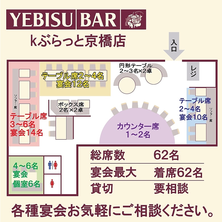 全席62席◇最大14名様のご宴会に対応◇大阪 京橋の飲み会・接待・昼宴会・女子会に♪飲み放題付コースご提供中!最大3名、4名、6名、8名、14名様までの飲み会に対応OK!