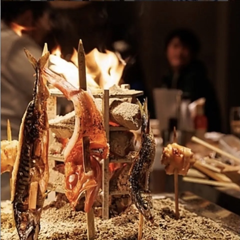 佐賀牛や京紅地鶏の炉端串焼き、新鮮な魚介の炉端焼きが自慢。