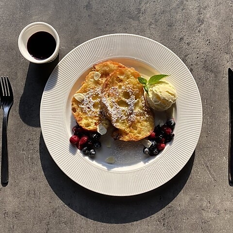 贅沢な「ブリュレフレンチトースト」は、外はカリッと中はふんわり。バニラアイスとフルーツの甘酸っぱさが絶妙にマッチします。デザートや軽食にぴったりの一品、ぜひお試しください◎