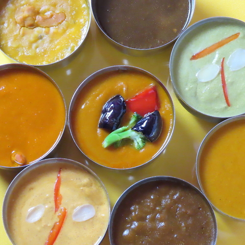 バターチキン、サンバ、冬の野菜カレー、チキンビンダル、ラッサムなど、本場仕込みの南インドカレーと5種類の焼きたてナンが勢ぞろい。ビニヤニ・ライス・サラダバーもついて、カレー&ナン計13種が食べ放題! ※小学生:1250円(税込)/児童:500円(税込)/3歳未満:無料