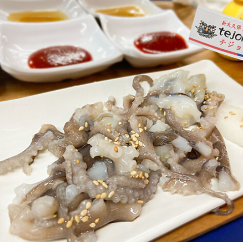 活きたまま調理し、まだ動いている状態で提供します。吸盤が口にくっつく独特の食感と風味はまさに珍味!ぜひ一度味わっていただきたい一品です。香ばしい胡麻油と酢コチュジャンの2種類のソースをご用意。数量限定なので、お早めのご注文をおすすめします!