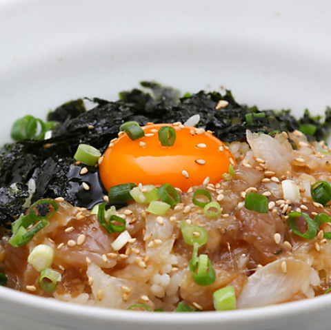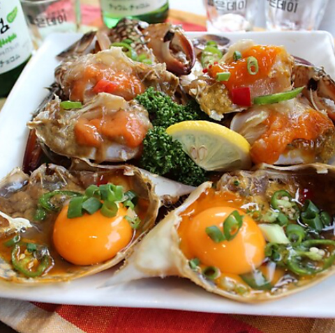 メスの渡り蟹を特製の旨味醤油に漬け込み、高クオリティかつコストパフォーマンスに自信があります。甲羅には蟹の卵や味噌、卵の黄身をトッピング。混ぜてトロトロにし、ご飯にかけても絶品です。足の身と一緒に楽しめば、さらに美味しさが広がります!
