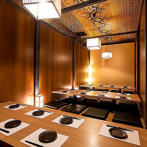 当店は、扉付き完全越室を多数完備しております。和情緒溢れる店内は、空間デザイナーが手掛けたもの。シンプルながら落ち着きある雰囲気で、ゆったりとお寛ぎ頂けます。2名様~団体様までご利用可能な個室席を完備しておりますので、飲み会や宴会、接待、女子会、歓送迎会などにおすすめです。