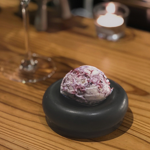 食後の締めにアイスクリームをお食べになる方多いです。見たことがない食材の組み合わせ(たまにしょっぱい味も)や、ラインナップもちょこちょこ変わるので、毎回新作が出るのを楽しみにされています。ワインや、その時のベルギービールにpairingもオススメです!