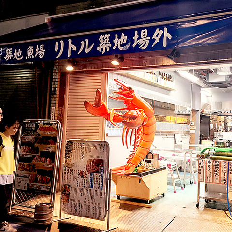 リトル築地場外の入り口に立つ巨大エビのオブジェ。鮮やかな色合いとユニークなデザインが通行人の視線を引きつけ、食欲をそそります。新鮮な海の幸を楽しむ前に、思わず写真を撮りたくなるスポットです。