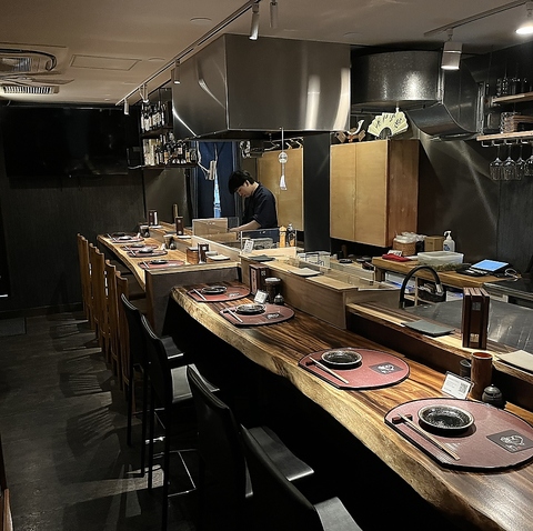 【デートに最適】お一人様でも過ごしやすいカウンター席は8席ございます。料理人が目の前で調理する光景を見ながら、お食事頂けるこちらのお席。料理人との会話や臨場感まで味わえます。是非ご利用ください。