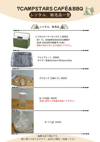 手ぶらBBQをさらに快適に!便利な当日販売&レンタル「あ!氷を買い忘れた!」「お肉を焼く油がない…」そんな時もご安心ください。当店では当日その場でお求めいただけるアイテムも充実しています!重い荷物を運ぶ手間なく、現地でサクッと揃えてBBQをスタートしましょう!