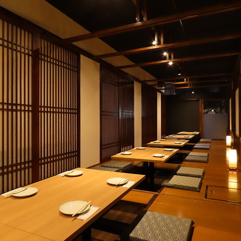 落ち着いた和の空間で、くつろぎの宴会をお楽しみ下さい。3名様から30名様まで、大小個室を完備しております。完全個室でプライベート空間をご用意しております。掘りごたつ式個室からテーブル個室、オープン席やカウンターなど使い勝手の良い居酒屋です。今日は会社の宴会で個室を。来週は友達とオープン席になど♪様々なシチュエーション◎