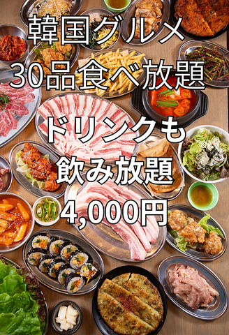 仕事帰りや二次会にぴったり!ポチャ人気の韓国料理30種とドリンク飲み放題が60分で楽しめるお得なプランです!短時間でもしっかり満足できる内容で、サムギョプサル・チヂミ・ヤンニョムチキンなど人気メニューが勢ぞろい!ご利用時間:60分(ラストオーダー30分前) 価格:2,500円(税込2,750円)※金・土・祝前日は混雑が予想されますのでご予約がおすすめです。