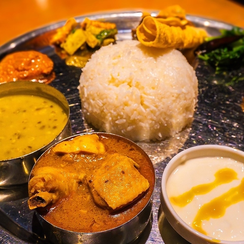 マトンorポーク…900円(税込) ●ダル ●カレー1種類(チキン、マトン、ポーク、野菜) ●タルカリ ●アチャール ●ライス ●パパド ●チャトニ