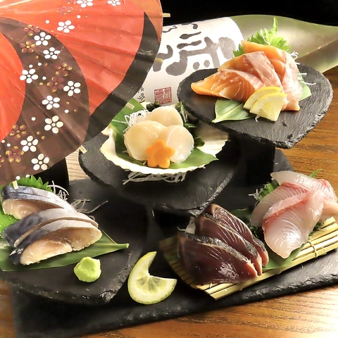 当店自慢の新鮮なお刺身を一品で堪能できちゃいます!目でも楽しめる【和傘】付きの階段盛りが素敵な逸品。