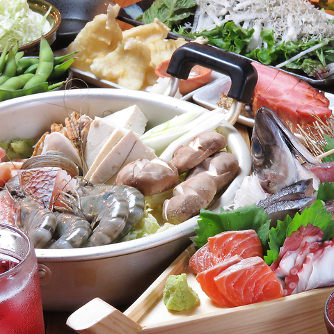 豊作コースは、豪華9品+2時間飲み放付きで4000円!刺身3種盛り・水炊き鍋・デザートまでお楽しみください!