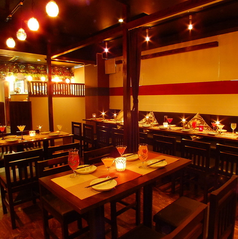 DOMODOMOの店内は、木の温もりと落ち着いた照明に包まれた開放感のある空間。広々としたテーブル席やゆったり座れるソファ席を完備しており、友人とのランチやおひとり様での利用にもぴったりです。大きな窓から光が差し込む昼の時間帯は、夜とはまた違った穏やかな雰囲気に。