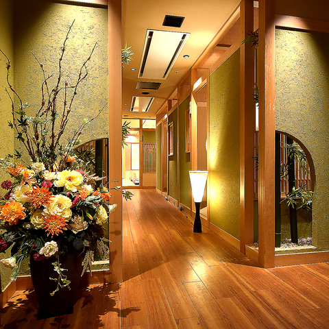通路や店内の装飾まで雰囲気にはこだわっております!少人数用個室から最大50名様収容の掘り炬燵席まで様々なお部屋をご用意!誕生日会や接待など様々な飲み会に対応!飲み放題付コースは3,500円からご用意しております。