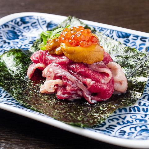 きめ細やかなサシが入った厳選和牛を贅沢に使用し、可愛らしい手鞠状に仕上げました。和牛本来の濃厚な甘みと、程よい酢飯の酸味が絶妙に調和し、口に入れた瞬間に至福の口溶けが広がります。見た目の華やかさはもちろん、お酒の席を彩る〆の一品としても最適。自分へのご褒美や、大切な方との特別な夜にふさわしい逸品。