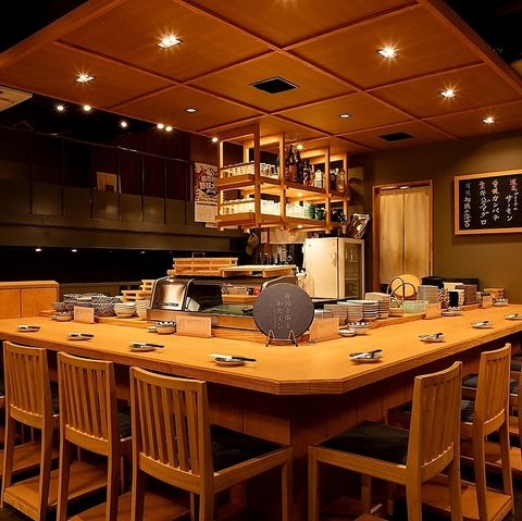 カウンターで大将が握り姿を見ながらお食事を愉しむことができる特等席。カップルやお一人様利用にも最適です。