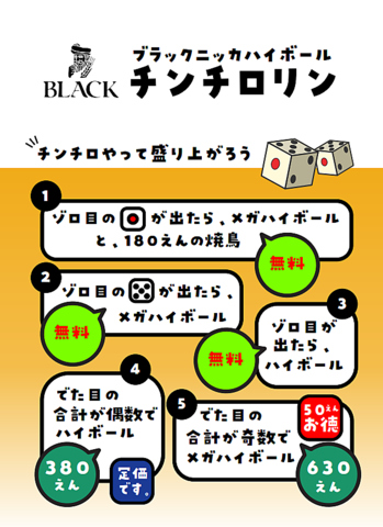 ゾロ目が出たら1杯無料!さらに1のゾロ目が出たらメガハイボールと180円の焼き鳥が無料に!!!
