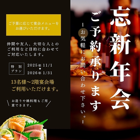 飲み放題90分1,650円、コース料理2,750円の満足セット!全7品※お鍋、1品料理等ご相談下さい。