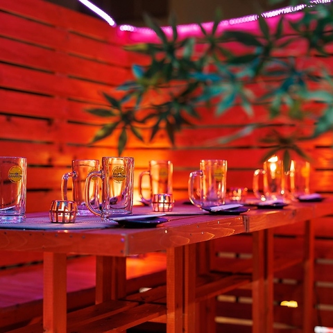 ビアガーデン気分を盛り上げるウッド調のテーブル席は、BBQでも手狭にならないよう十分にゆとりを持った広さのお席。テーブルは自由自在に移動することが出来るため、ご来店人数に合わせたレイアウトをいたします。気持ちの良い屋上テラス席で極上のひと時をお過ごしください♪