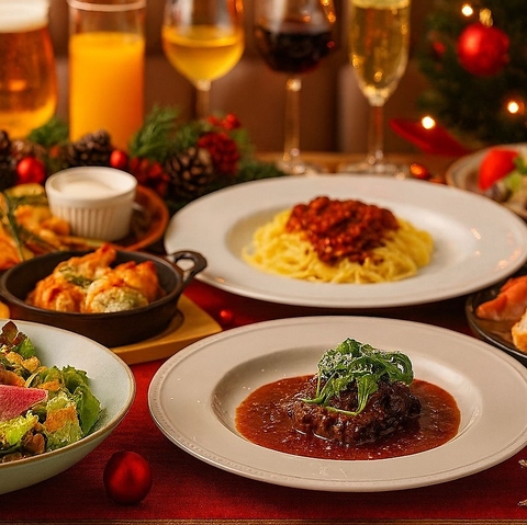 充実の前菜盛合せを始め、サラダや温菜、お肉のメインディッシュ、パスタなど創作イタリアン料理に、生ビール・スパークリングワイン含む約100種以上のドリンク飲み放題付きコースをご用意しております!忘年会、同窓会、歓送迎会、懇親会、誕生日、女子会など各種パーティーシーンでお楽しみ下さい♪