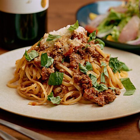 赤ワインでじっくり煮込んだミートソースたっぷりでどうぞ。