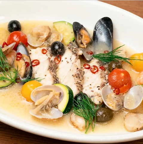 お肉だけではなく、鮮度の良いお魚も楽しめるのが当店の自慢◎その中でも鮮度の良いお魚で作るアクアパッツァは大人気◎その日に仕入れた新鮮なお魚で作るため、なんのお魚で作るかは当日のお楽しみ!バケットも一緒にご注文下さい。白ワインやスパークリングワインとの相性も抜群です。