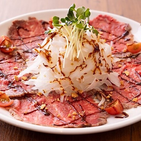サラダ感覚でも楽しめる、当店名物の「牛タタキのカルパッチョ」は注文必須の人気商品。国産の黒毛和牛のモモ肉にたっぷりのオニオンスライスを巻いて自家製のバルサミコ酢と一緒にお召し上がりください♪赤ワインと合わせて食べるのもおすすめ!