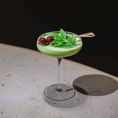 八女抹茶にホワイトチョコとヘーゼルナッツリキュールを合わせた、大人の抹茶ラテカクテル