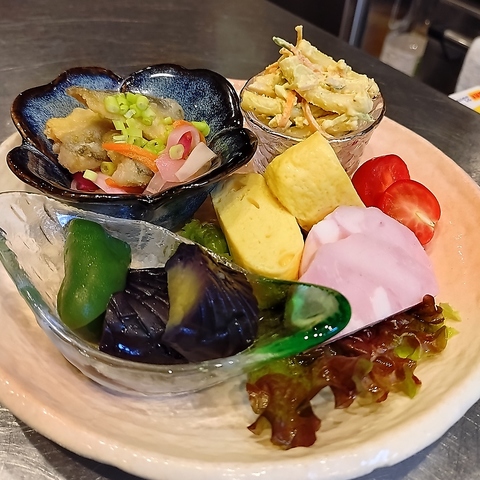 鮮魚の南蛮漬け、マカロニサラダ、お浸し等おばんざいの盛り合わせ。内容は日によって変わります。(写真はイメージです)