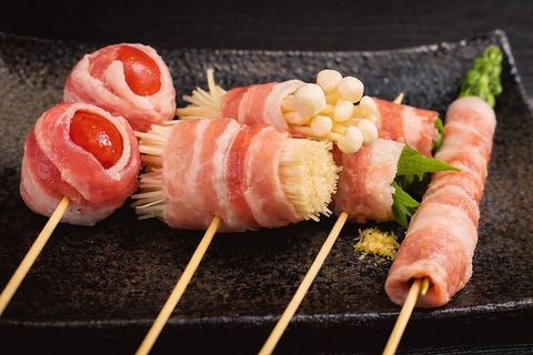 鉄板で焼き上げる『鉄板串』が新たに登場!国産豚を使用した串焼き『焼きとん』は希少部位も合わせた全6種類をご用意!さらに野菜を豚肉で巻いた『肉巻き野菜串』も4種類登場!お酒のアテに気軽に1本からご注文頂けます!