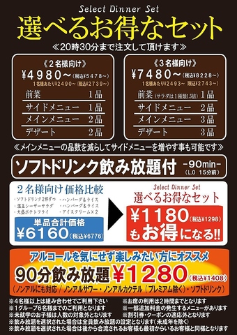 [2名様向けメニュー例:ソフトドリンク2杯ずつ、ハンバーグ&ライス、温玉シーザーサラダ、ハンバーグ&ライス、大盛ポテトフライ、アイスクリーム×2]単品合計価格6776円(税込)が、【選べるセット】でご注文頂くと1298円(税込)もお得になります!ぜひお得にお楽しみくださいませ♪詳細はコースページをご覧下さい◎