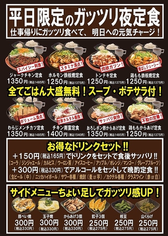 仕事帰りにガッツリ食べて、明日への元気チャージ!★メインメニューやサイドメニュー、ドリンクはお好きなものをお選びください!更にドリンクは165円(税込)追加でアルコールは+330円税込で変更OK◎ボリューム満点、頑張ったディナーにおすすめのメニューを沢山ご用意しております