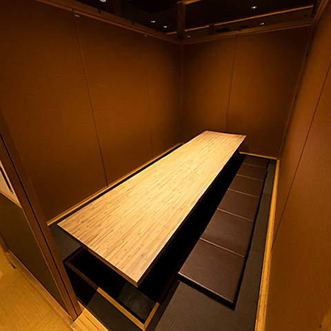 柔らかな照明と木の質感が心地よい掘りごたつ個室!足元ゆったりで長時間の飲み会も快適に過ごせます!落ち着いたブラウンを基調とした空間は、ゆったり過ごしたい仕事帰りの一杯にもオススメです!