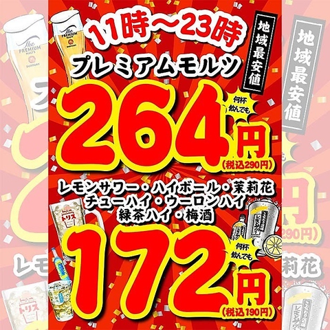 | サワー | プレーンチューハイ、ウーロンハイ、緑茶ハイ、レモンサワー、グレープフルーツサワー、ゆずサワー、梅サワー、カルピスサワー、クエン酸サワー、ジンジャーサワー、柚子ジンジャーサワー、梅ジンジャーサワー |