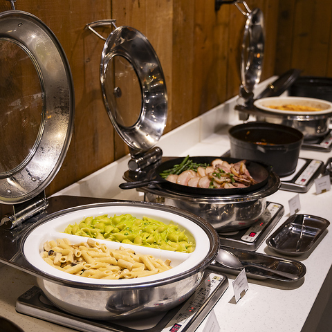 9種類の季節の野菜サラダ仕立て/シェフおすすめ4種のオードブル/旬の和惣菜4種/サンドイッチ2種/サーモンのマリネ/唐揚げ/フライドポテト/ピッツァカプレーゼ/コーンスープ/きのことベーコンのクリームペンネ/ナポリ風スパゲティ/自家製ドリア/ラタトゥイユ/ビーフカレー/白身魚のフライ/ローストポーク/ご飯/カットケーキ2種/ティラミス/90分飲み放題
