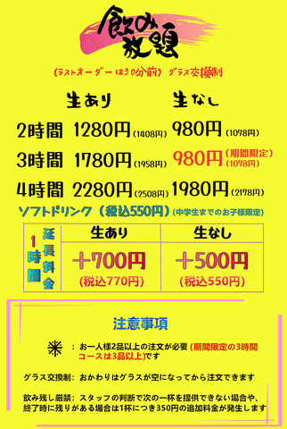 【飲み放題/2時間980円~】「時間無制限!/4時間/3時間/2時間プラン/深夜プラン(お得!)をご用意!