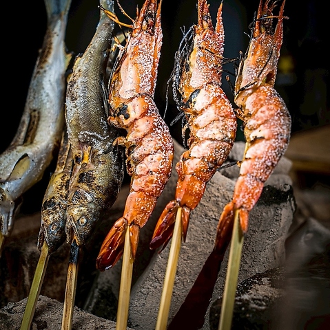 囲炉裏でじっくり。新鮮な鮎や大海老をご用意しております!目の前で徐々に食材が変化する様を愉しむのもカリスマ流。厳選したお酒と会話を楽しみながら、お待ちください。鮎はパリッとした皮と、ふっくらしたクセのない身、絶妙な塩加減です。是非お召し上がりください!!
