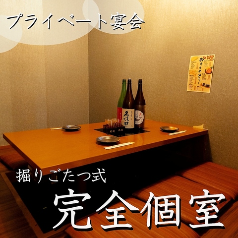 雰囲気自慢の掘りごたつ席は完全個室、半個室の各種ご用意しております!!周りを気にせずゆったりお寛ぎいただける人気の席となっております!!掘りごたつ席は団体様にもご利用いただけるレイアウトとなっており、会社宴会や結婚式の二次会、歓送迎会など様々なシーンに対応しております!!立川八王子での大型宴会に◎